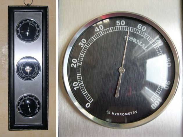 À gauche, une station météo de salon, comprenant du haut vers le bas, un hygromètre, un baromètre et un thermomètre. À droite un gros plan de l'hygromètre.