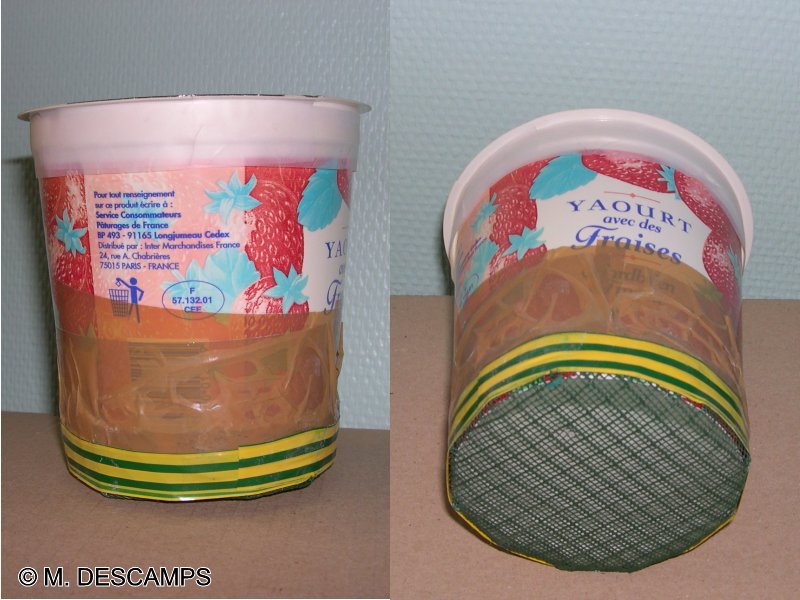 matériel nécessaire : 2 pots (de grande taille comme le pot de yaourt illustré ci-dessous). Le fond du pot supérieur a été remplacé par un grillage à maille fine.